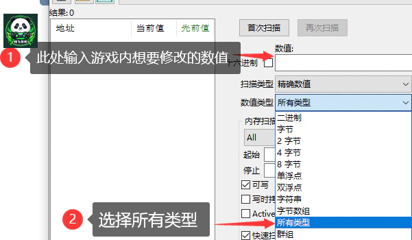 3、在数值框处输入你想游戏内想要修改的数值,数值类型选择“所有类型”