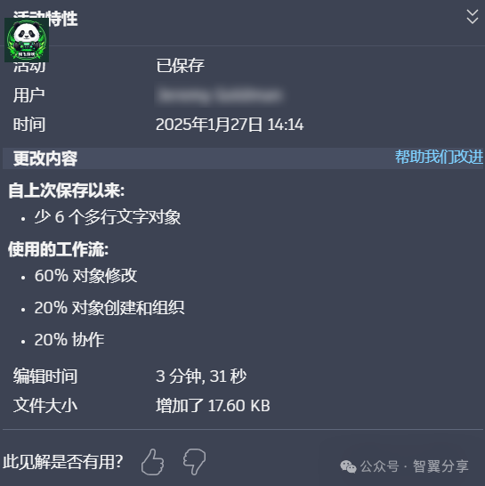 新的“更改内容"见解概述了在“保存的活动”之间所做的编辑,从而允许您高效地继续工作。