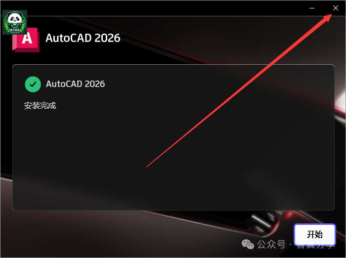 安装 AutoCAD 2026完成,点击X关闭,不要点击开始