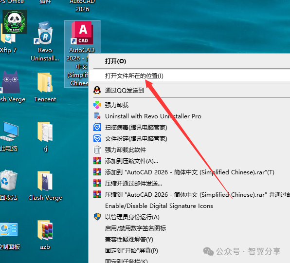 在电脑桌面找到AutoCAD 2026,鼠标右键打开文件所在的位置进入