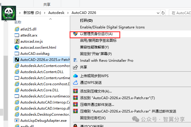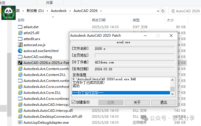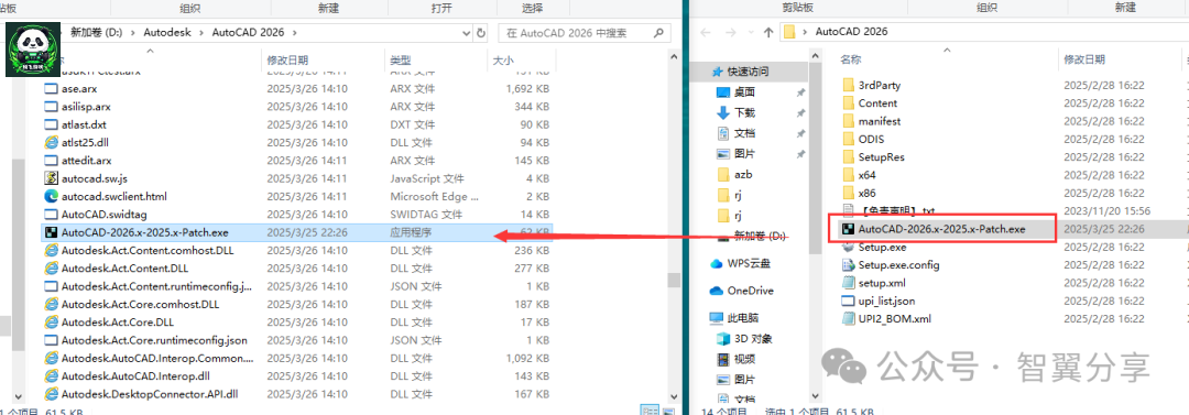 将安装包的【AutoCAD-2026.x-2025.x-Patch.exe】(注意:如果你安装包没有的话,就是你没有关闭杀毒软件及防火墙导致的)复制到刚才打开的软件安装目录位置