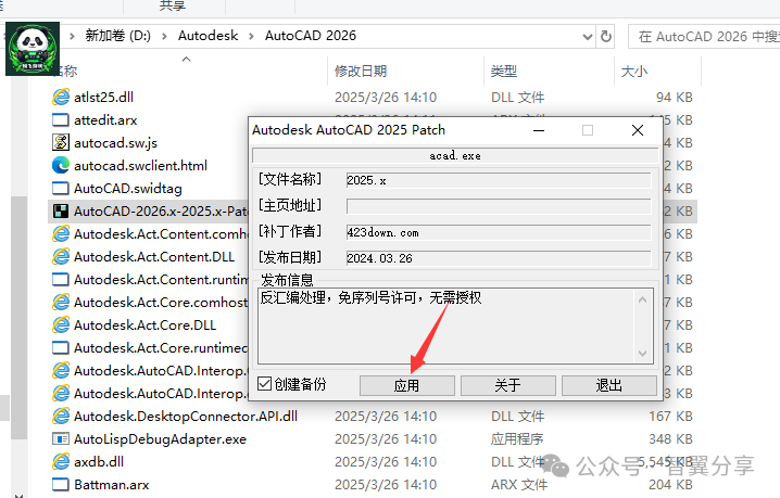 点击【应用】开始破解(特别说明:本注册机虽然写着Autodesk AutoCAD 2025 Patch,同样适用于CAD 2026版本)